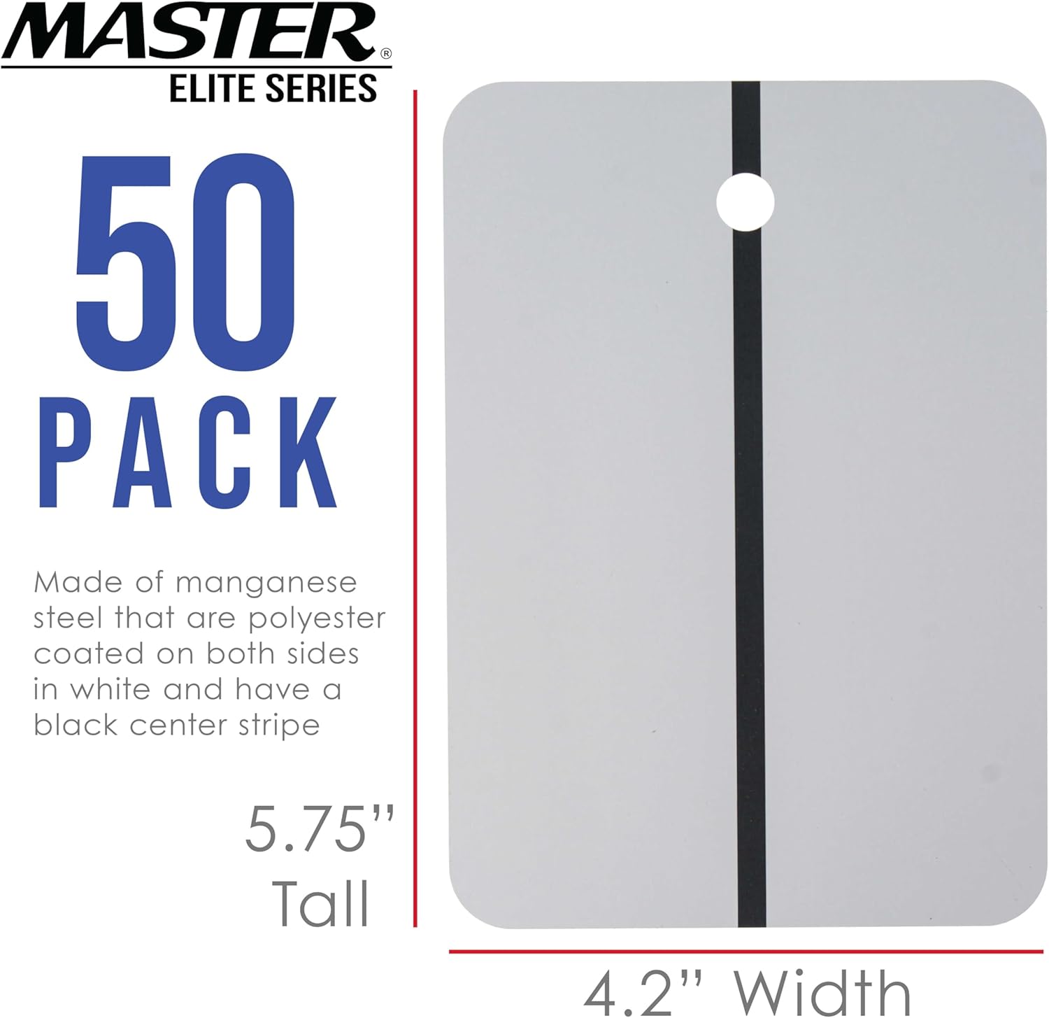- Sturdy 5.75″ long x 4.2″ wide x 0.17mm thick rectangular spray-out test panels made of manganese steel that are polyester coated on both sides in white and have a black center stripe.