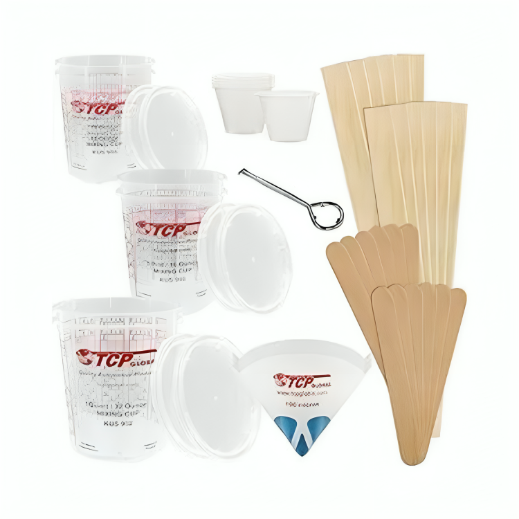 - 6-ea 1-Oz Cups, 12-ea Automotive Grade 190 Mesh Paint Strainers, 12-ea Full 12″ Wooden Paint Paddles